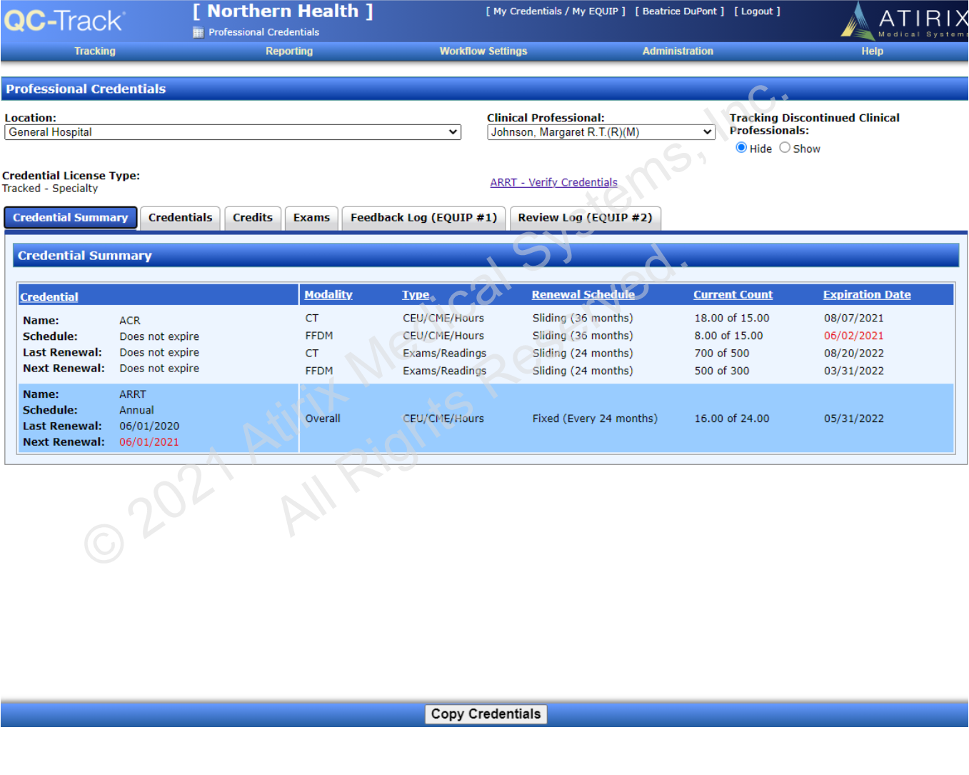 QC-Track.Credentials - Enhanced includes all of the capabilities of the Standard offering and adds detailed tracking for CEU/CME and exam count by modality. The point-in-time and rolling window tracking features simplify compliance with the ACR’s continuing education requirement and automatically identify and notify personnel of expiring credentials.